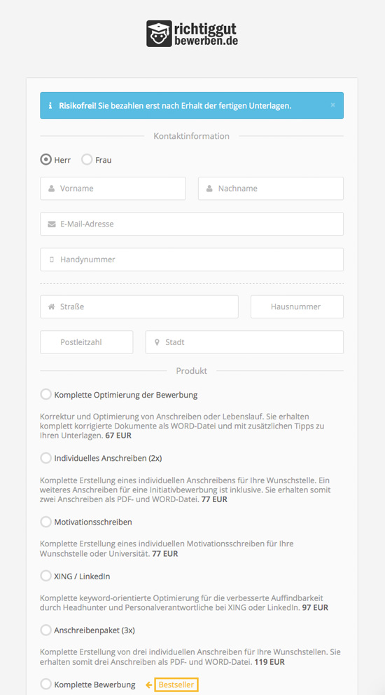 Zwar bietet richtiggutbewerben.de insgesamt die günstigsten Preise an, doch leider konnte die Qualität des erstellten Anschreibens im Gegensatz zu den anderen Anschreiben nicht vollends überzeugen.
